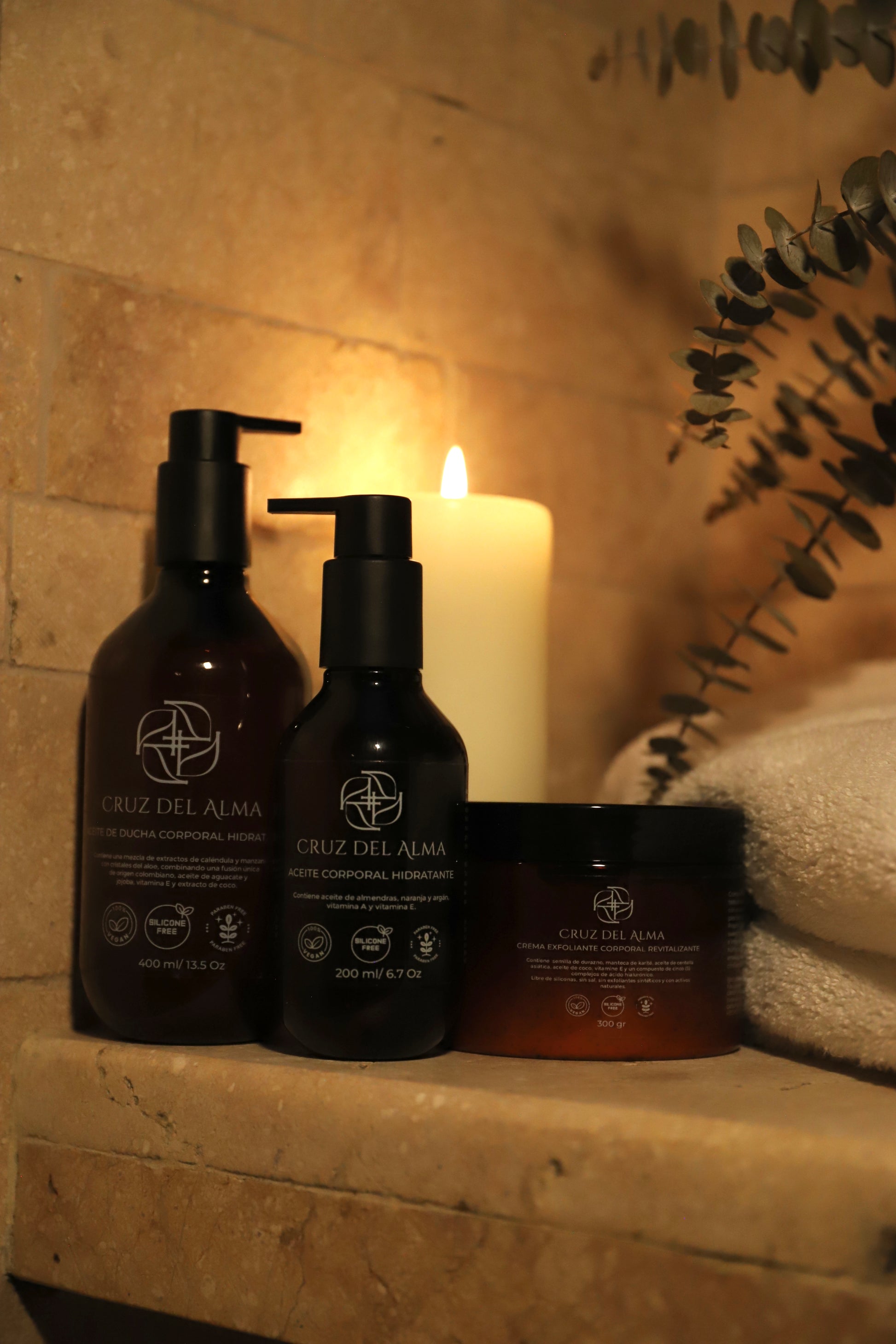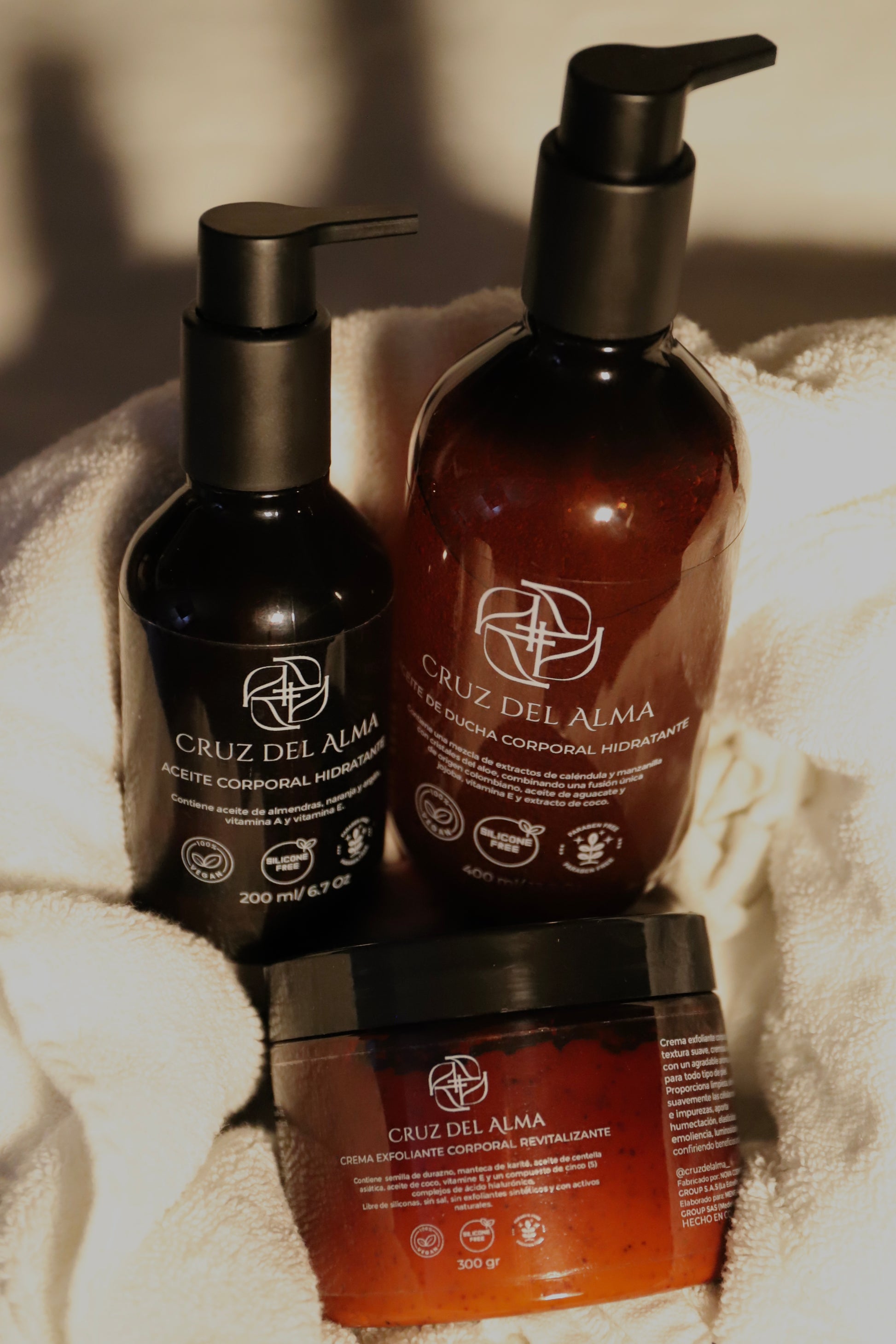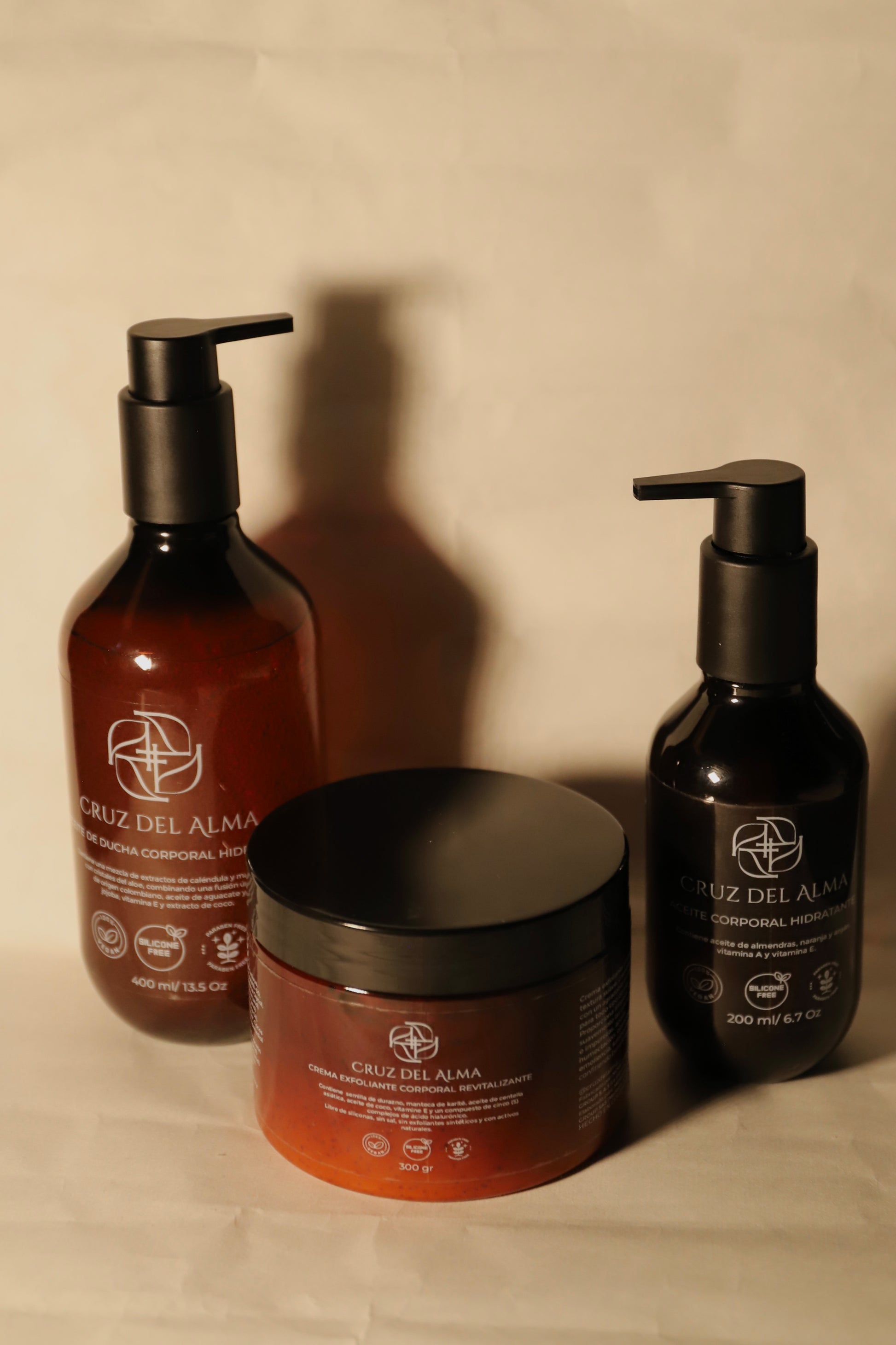 Descubre el ritual más completo de Cruz del Alma. Nuestro kit reúne los tres esenciales para llevar tu piel a un nivel de hidratación y cuidado supremo: el Aceite de Ducha que limpia suavemente, el Exfoliante que renueva en profundidad y el Aceite Hidratante que sella la nutrición. Una experiencia sensorial que envuelve tu cuerpo en suavidad, brillo y bienestar, para que cada día sea un acto de amor propio.